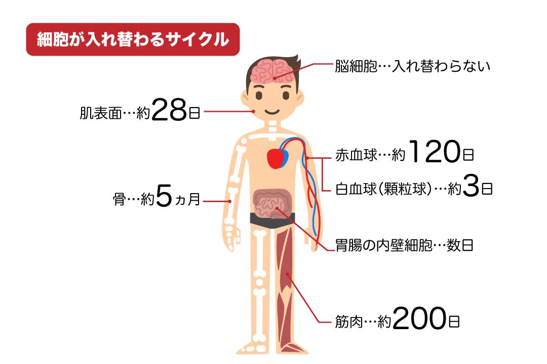 私たちは一つの細胞を長く使うことができないため、新陳代謝によって、ほんの少しずつ毎日入れ替わっているのです。